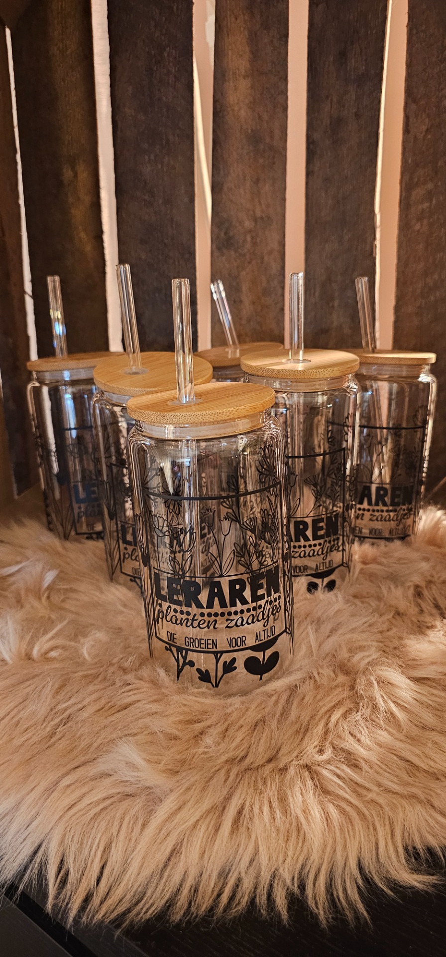 Een strak vinyl ontwerp op je glazen tumbler. Minimalistisch, stijlvol en duurzaam, perfect voor namen, quotes of sommige logo's. Een glazen tumbler met vinyl geeft een persoonlijke touch en blijft lang mooi.